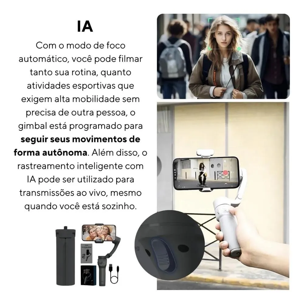 Com controles intuitivos no próprio equipamento, permite alternar modos de gravação, ajustar ângulos e acompanhar movimentos com precisão. Compatível com a maioria dos smartphones do mercado, é ideal para vídeos em redes sociais, YouTube, TikTok, Instagram, transmissões ao vivo e produções audiovisuais.